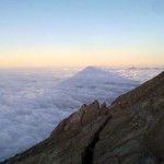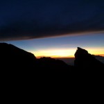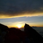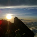 Uns beschleichen Zweifel, ob alle unsere Gruppenmitglieder die ganzen 1500 Hm rechtzeitig schaffen. Die Guides sind aber zuversichtlich. Und tatsächlich sind wir deutlich vor Sonnenaufgang auf dem Gipfel; nur nicht auf dem richtigen, dem höchsten, sondern auf einem der zwei anderen kleineren Gipfel des Agung-Kraterrandes. Etwas entäuscht sind wir schon. Mit dem Feldstecher machen wir auf dem Hauptgipfel drei (!) Berggänger aus.