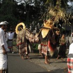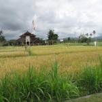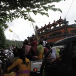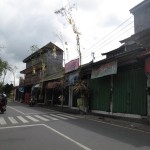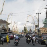 Es war ja ein höchst feierlicher Tag, und alle Balinesen waren unterwegs mit ihren Rollern, wenige mit Autos. Alle aber herausgeputzt für den grossen Tag, was dann darin gipfelt, dass sich NIEMAND – ausser die paar armen Touristen – an die eigentlich gültige Helmpflicht hält. Die wird ja auch sonst für kurze Strecken ignoriert, aber theoretisch gibt’s die schon auf Bali, nur gilt sie an Galungan offensichtlich nicht. Herausgeputzt sind aber nicht nur die Balinesen, sonder auch alle Orte. Es ist ein echtes Highlight, zu so einem Feiertag ein Rundfährtchen zu machen. Wo du hinschaust mit liebevoller Hingabe handgefertigte, kompostierbare Deko aus Palmblättern. Wunderschön!