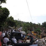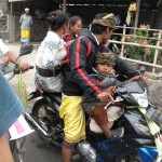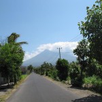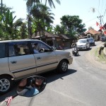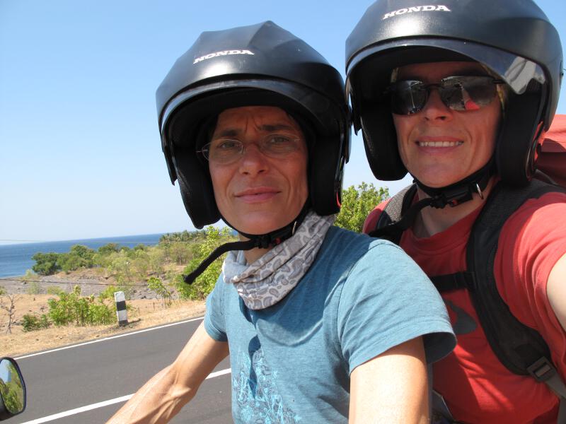 Wir kamen dann auch schon bald in einen Riesenstau, weil in einem klitzekleinen Dorf sämtliche Einwohner im weiteren Umkreis mit Kind und Kegel zur Zeremonie des dortigen Tempels wollten. Erstaunlich daran war, dass niemand deswegen irgendwie gereizt gewesen wäre. Nix da, lachende Gesichter ringsumher, und jeweils ein freudiges Hello zu uns, weil wir uns aus dem heiligen Anlass auch im Sarong aufs Moped gesetzt hatten. Eine gute halbe Stunde später konnten wir wieder flott Fahrt machen, was bei den Strassenverhältnissen abseits der grossen Verkehrsachsen dann maximal 30 km/h bedeutete.