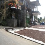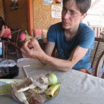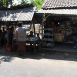 Hungrig kamen wir schliesslich in unserem ersten Etappenziel Amed an, rechtzeitig zur Mittagszeit! Also schnell einen kleinen Warung suchen, der nett aussieht. Warung Wajan hiess der (was für ein Wunder!) und gehörte aber einer Frau. Wir hatten inzwischen aber gelernt, dass einfach ALLE Erstgeborenen auf Bali Wajan getauft werden (und zwar egal ob Männlein oder Weiblein, weswegen die sich dann auch schleunigst einen zweiten Namen zulegen, wenn sie älter sind), deswegen waren wir nicht überrascht. Das Essen war sehr lecker und es gab obendrein auch noch viele Leckereien zum Kosten als Dessert; Urschis (=Übriggebliebenes für Nichtwissende) von der Zermenonie vom Morgen. Das finde ich das sympathische an den Balinesen: die opfern irrsinnig leckere Köstlichkeiten an den Zeremonien, packen sie dann wieder ein und essen sie dann selbst 🙂