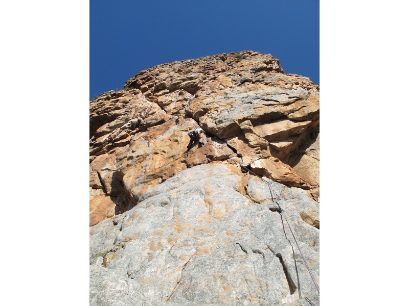 schöne Linie, dem rechtsstrebenden Riss entlang, aber huere steil mit 2L Wasser im Rucksack und den Schuhen am Gurt *chnorz*