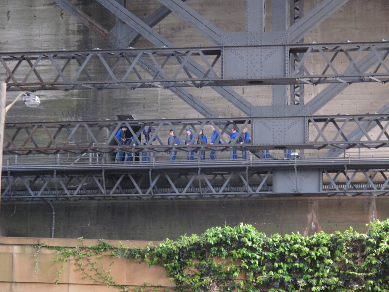 Wohlhabende Touris gönnen sich «The climb of your life» und krabbeln für 250$ in hässlichen blauen Overalles über die Harbour Bridge.